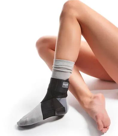 The brace is fastened by means of a diagonal strap. Elastic straps apply pressure around the ankle. Inversion/eversion movement of the ankle is restricted while plantar/dorsal flexion is allowed adequate freedom. This means that no inhibition is felt during normal walking and running. The Push Aequi is worn over the sock, and optimal stabilisation can only be achieved if it is worn with a closed (laced-up) shoe.